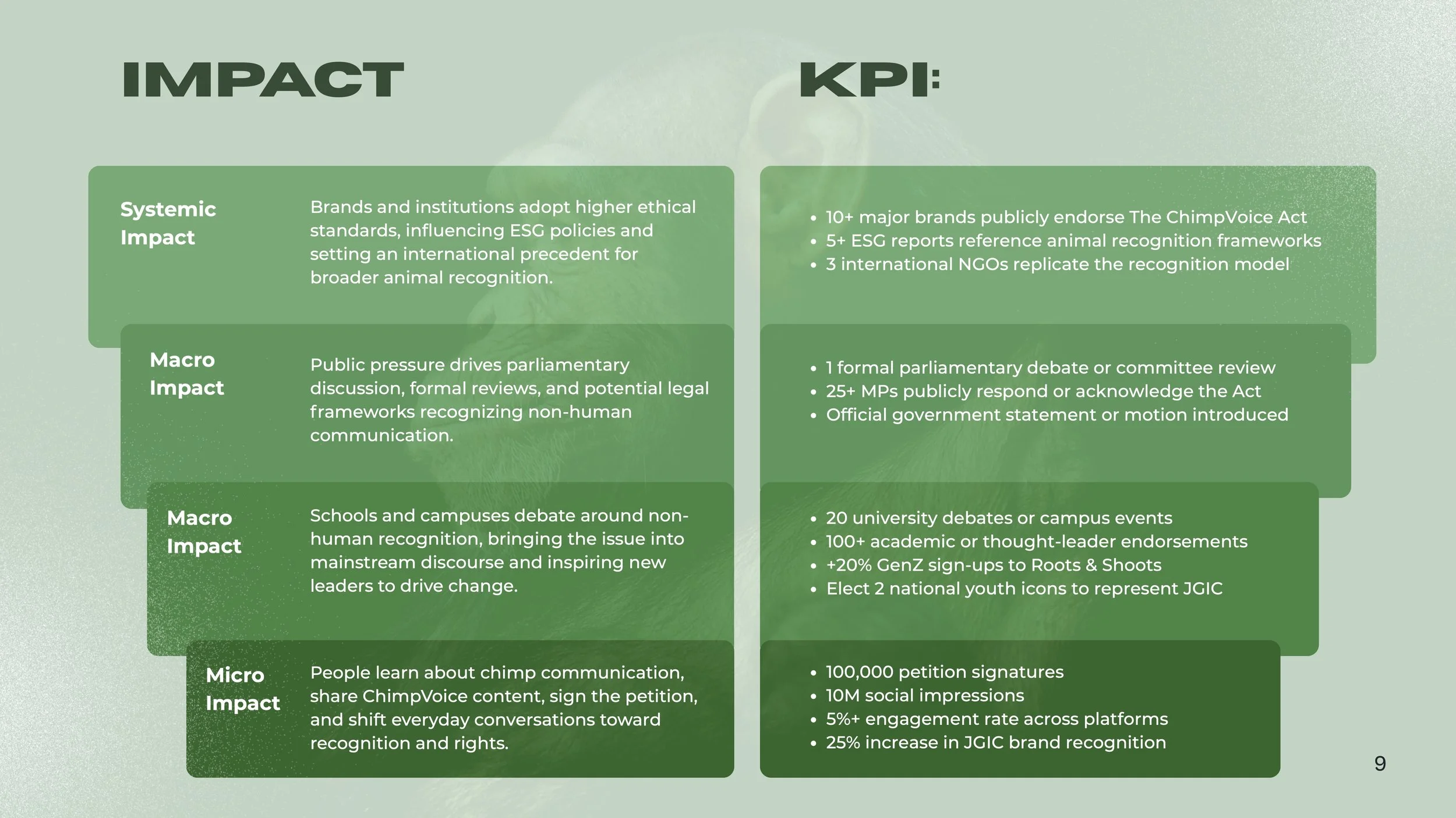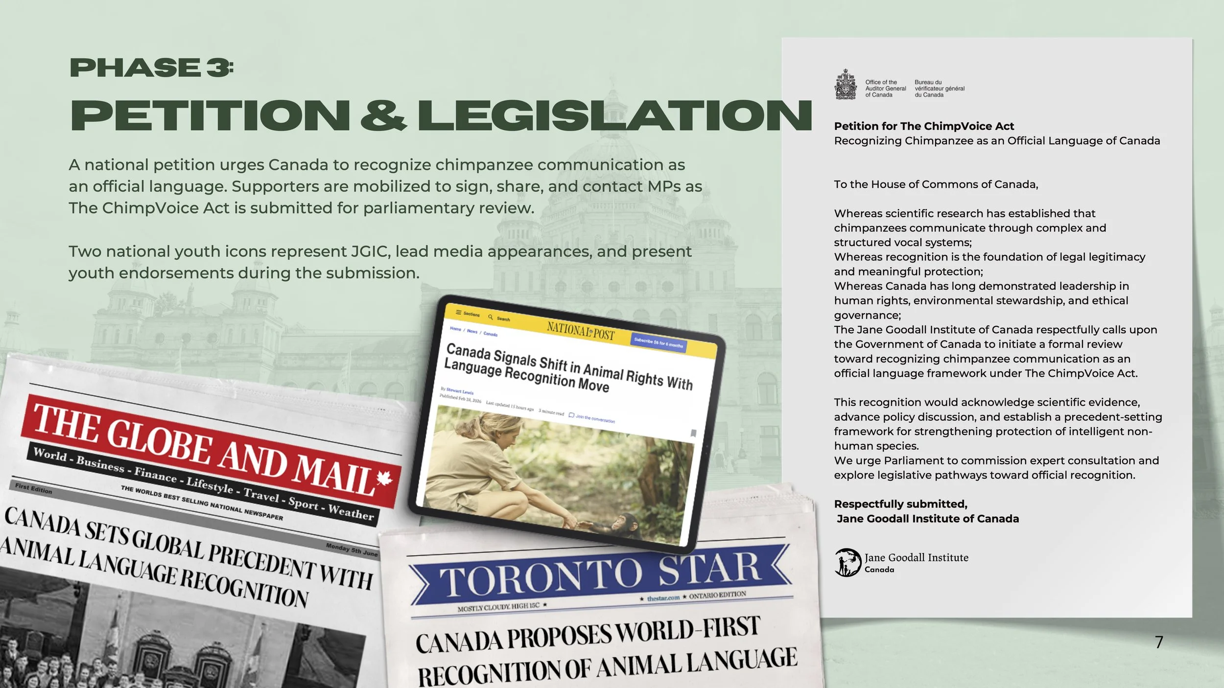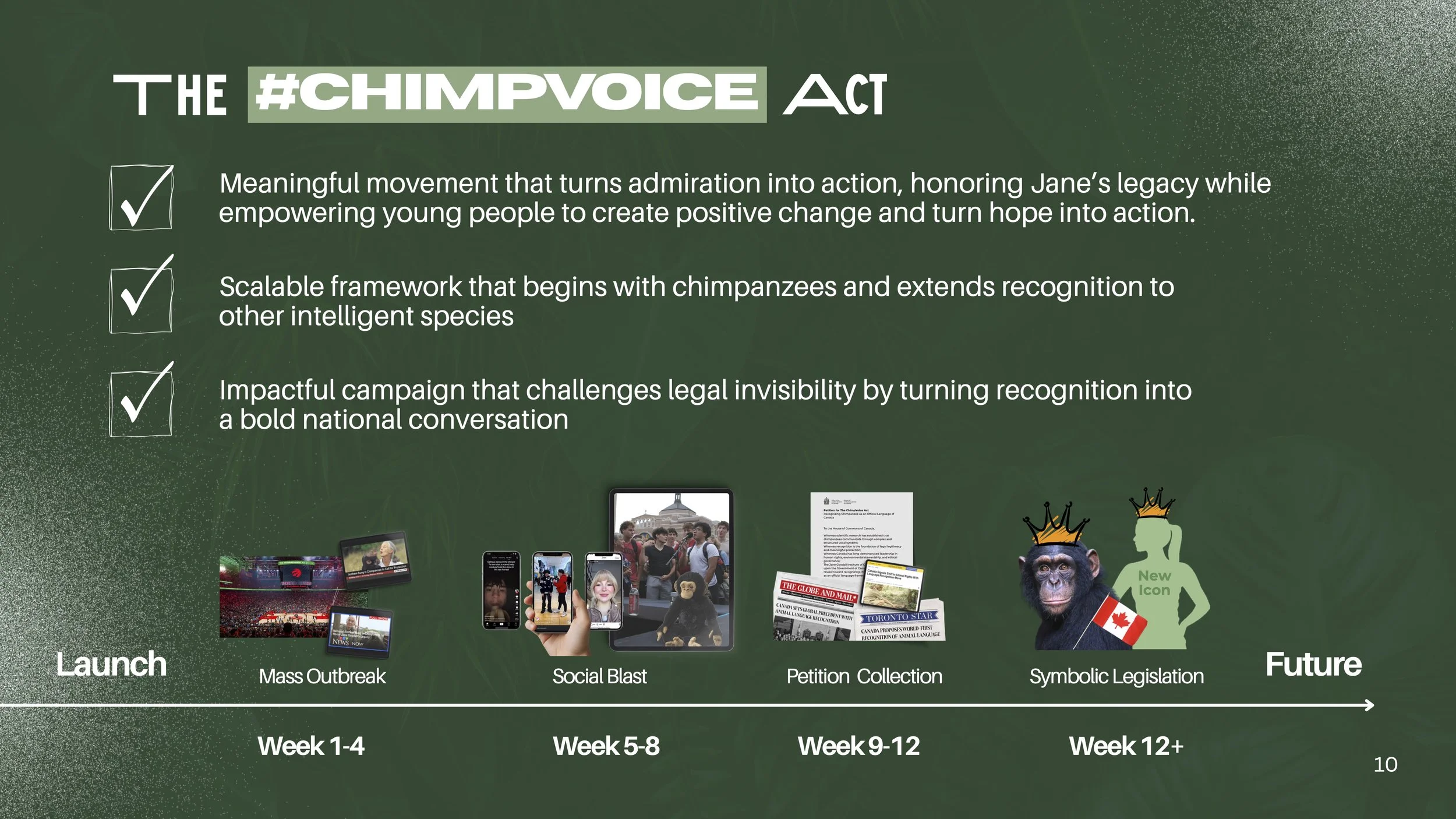 By transforming recognition into a civic movement, the ChimpVoice Act positions Canada as a leader in ethical progress while creating a scalable framework that redefines protection not just for chimpanzees, but across species.